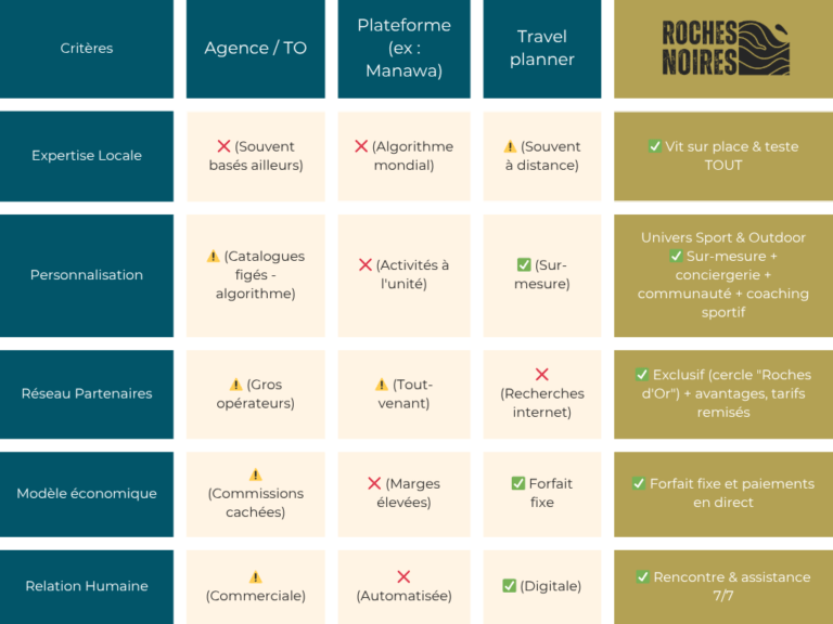 Chez Roches Noires, je facture une prestation claire et assumée : le temps, l’expertise et la création complète de votre voyage. En contrepartie, je vous fais bénéficier de tarifs négociés, sans surmarge cachée sur les prestations.